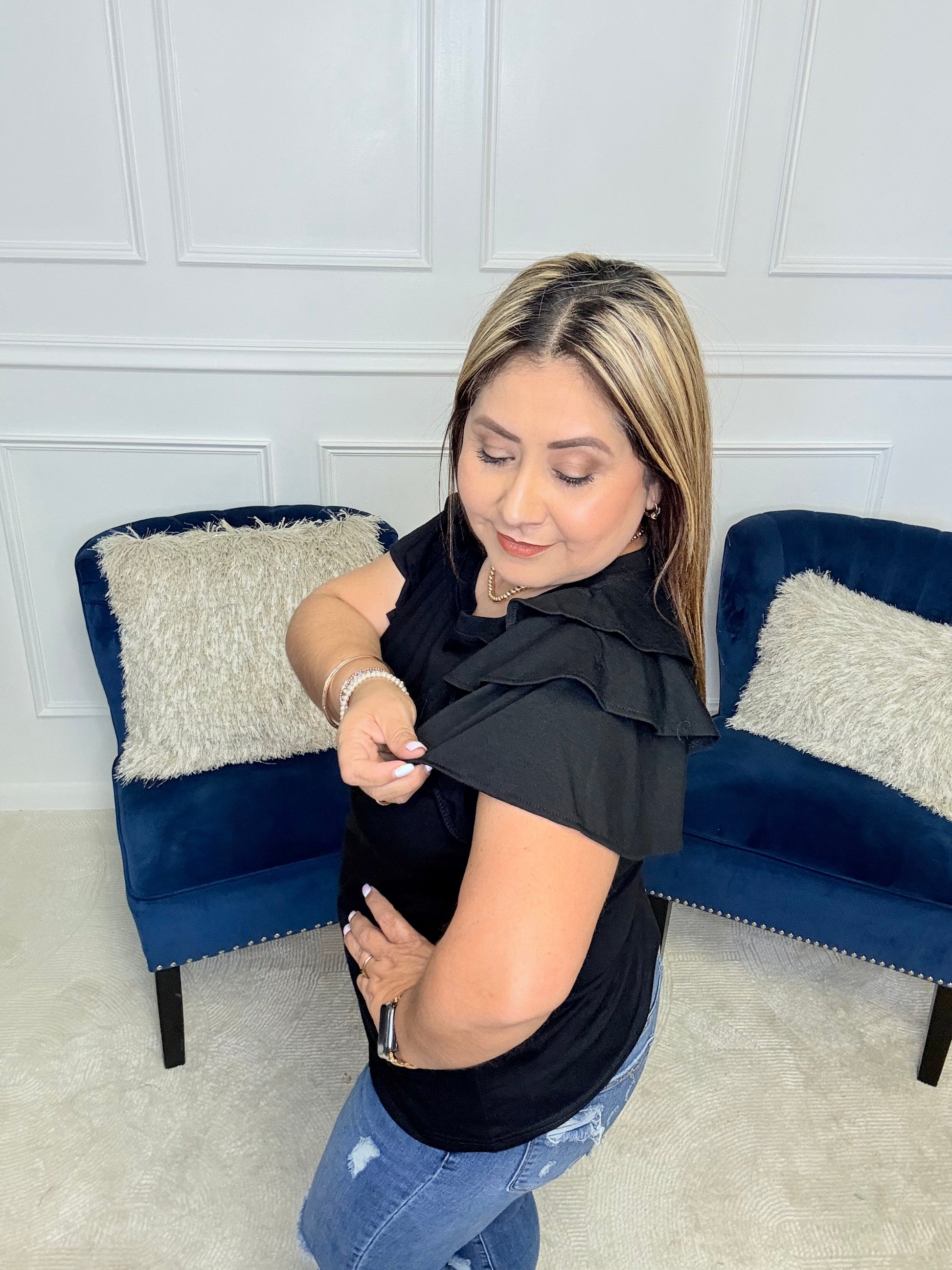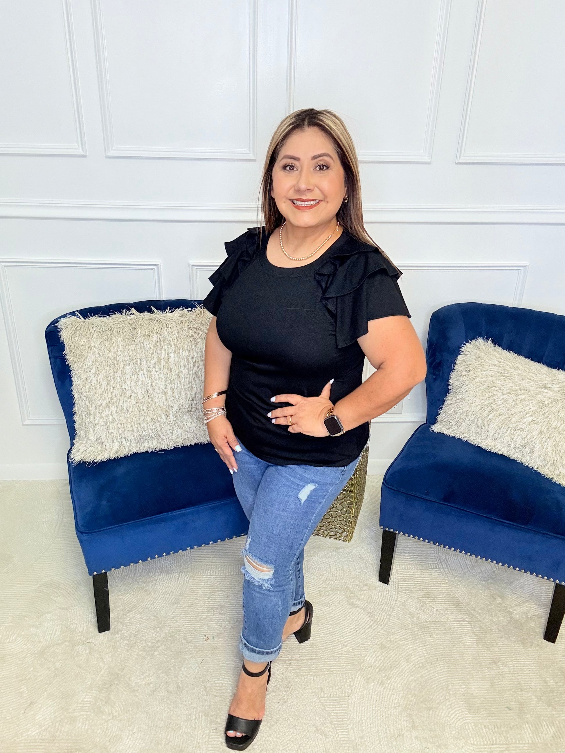 Experience style and comfort with our I'll Allow It Ruffle Sleeve Tee! Made with lightweight ribbed jersey knit for a soft and breathable feel. The banded round neckline and layered flutter sleeves add a touch of elegance to this classic black tee. Get yours now and elevate your wardrobe!