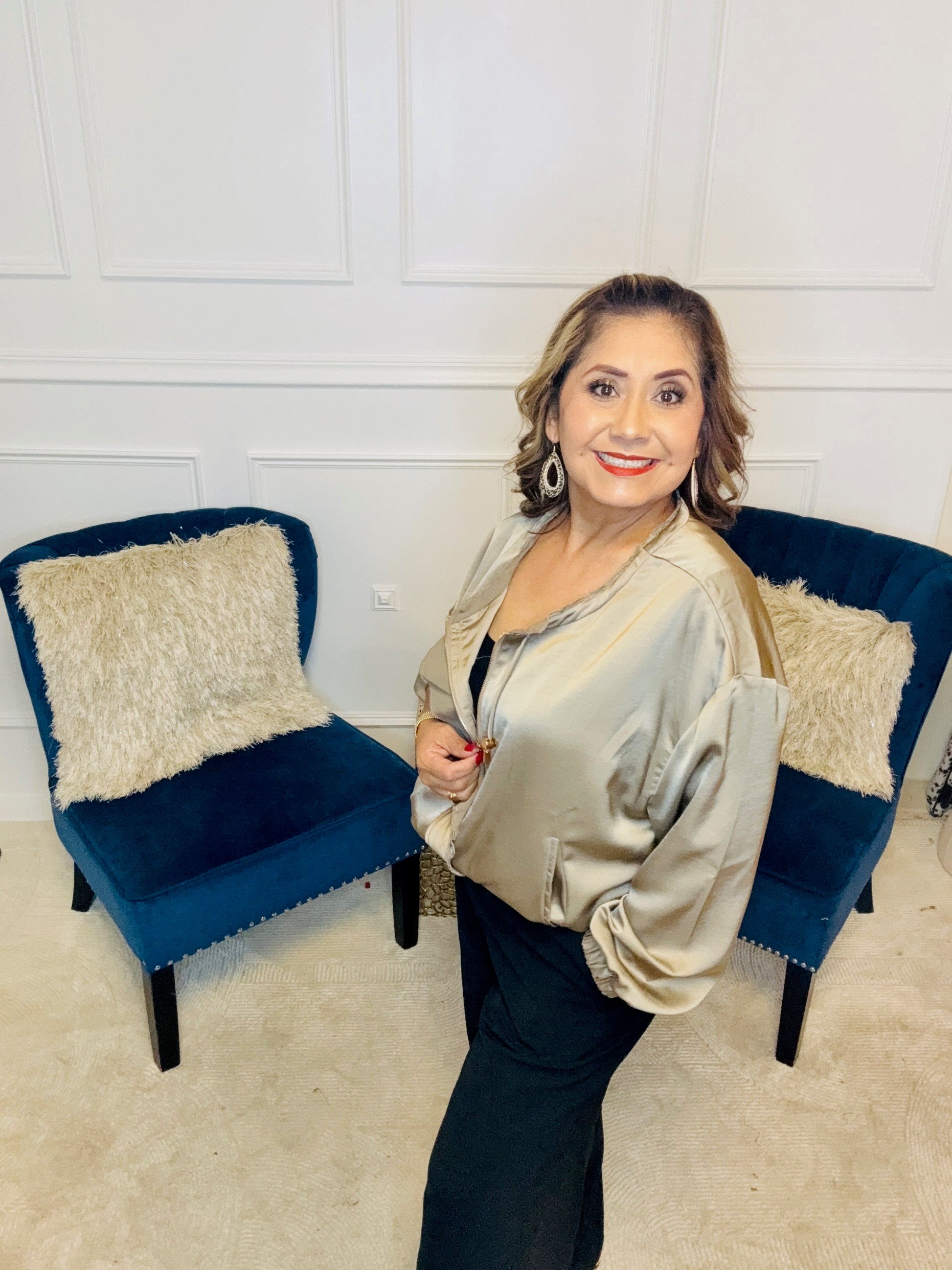 The jacket is a light beige or cream-colored, silky material with a V-neckline and long sleeves. It appears to be a loose-fitting, open-front design, possibly made of satin or a similar fabric. The jacket is worn over a black top and paired with black pants, creating a stylish and elegant outfit.