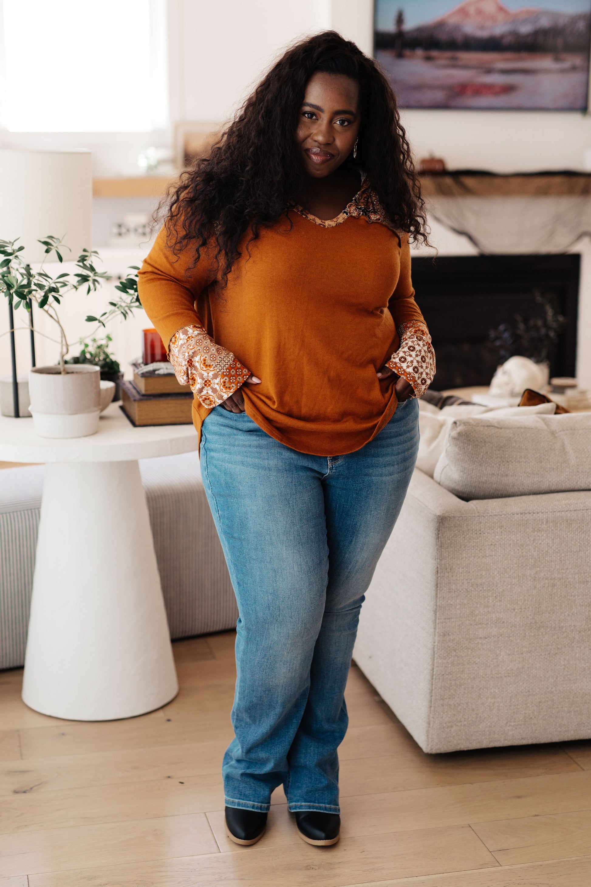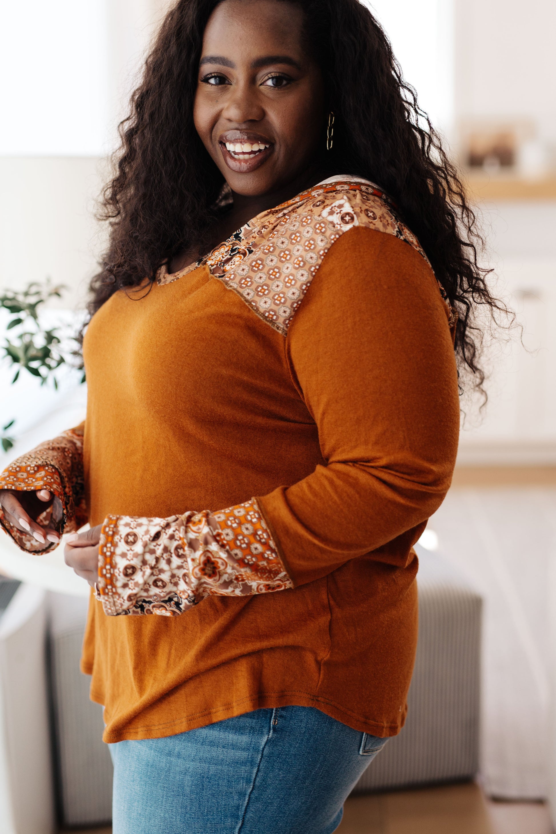 Stay cozy while expressing your sense of style in our Sipping Iced Tea Mixed Print Hoodie. Featuring a brushed knit design, V-neck, hood, and patterned accents, this hoodie is the perfect layering piece for cooler days ahead. The exposed seams add a unique touch to complete the look.